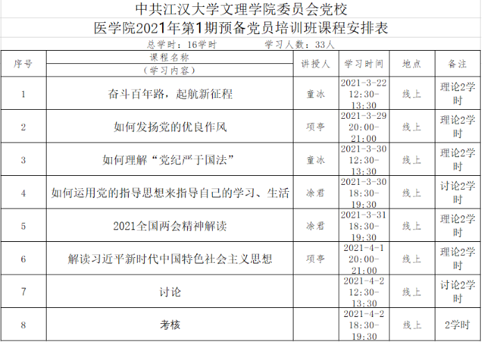 由于本次部分参加培训人员为2017级学生在外实习,秉着不让每一位同志掉队的精神,今年上半年的第一期“预备党员”培训改为线上培训,以网络授课的形式开展。培训组织工作由yl6809永利集团党务工作小组负责,本次“预备党员”培训时间为2021年3月22日至4月2日。本次培训采用QQ群群课堂的形式,配以人员随时记录听课人数为考勤记录,增加自主研讨内容,考核方式为考试、心得体会和出勤情况三者综合打分。授课内容以学校党委《培训大纲》为基准,并增加了时事内容。培训授课老师由学生党支部书记童冰及支委项亭、凃君三位老师担任。
