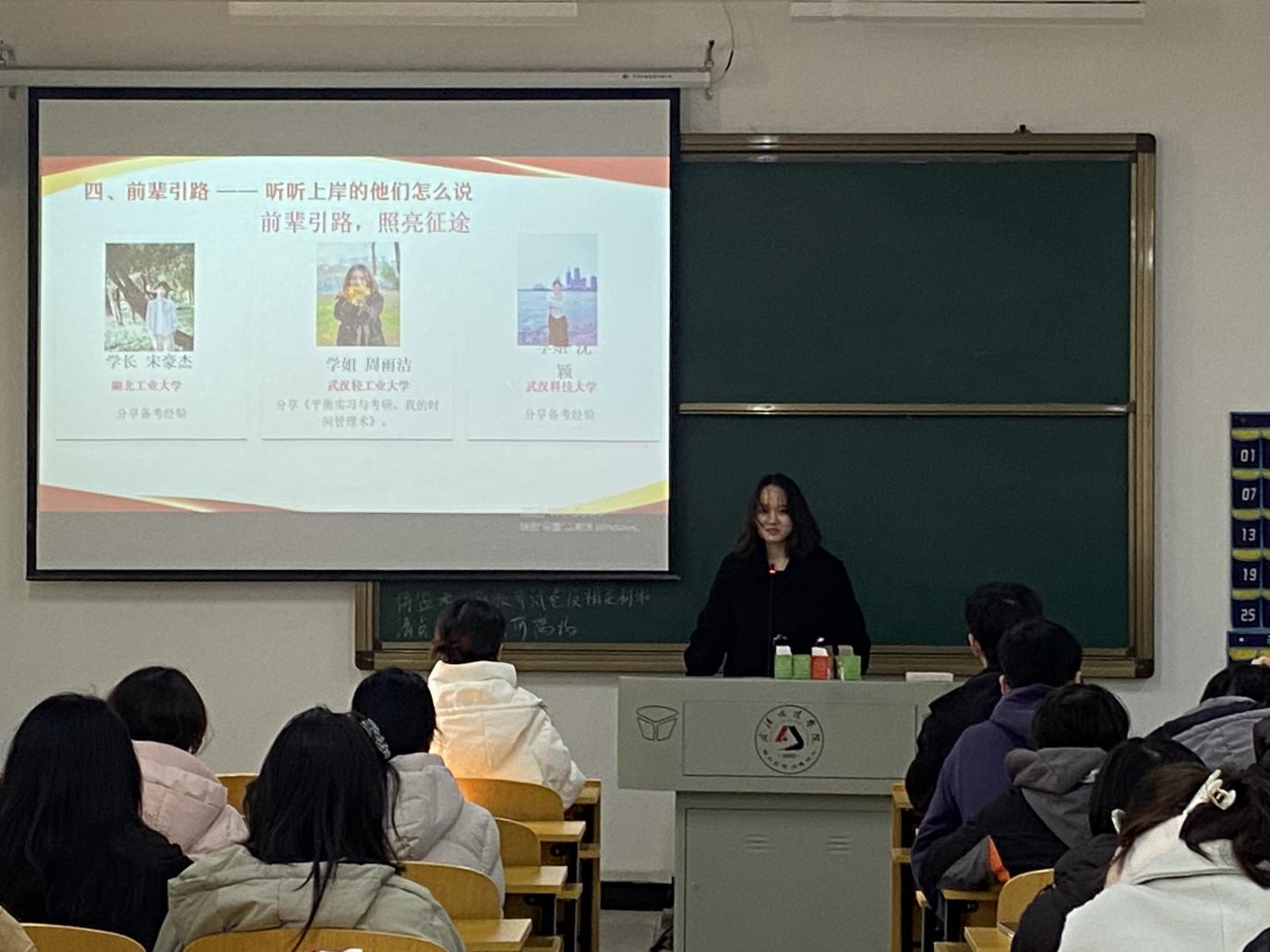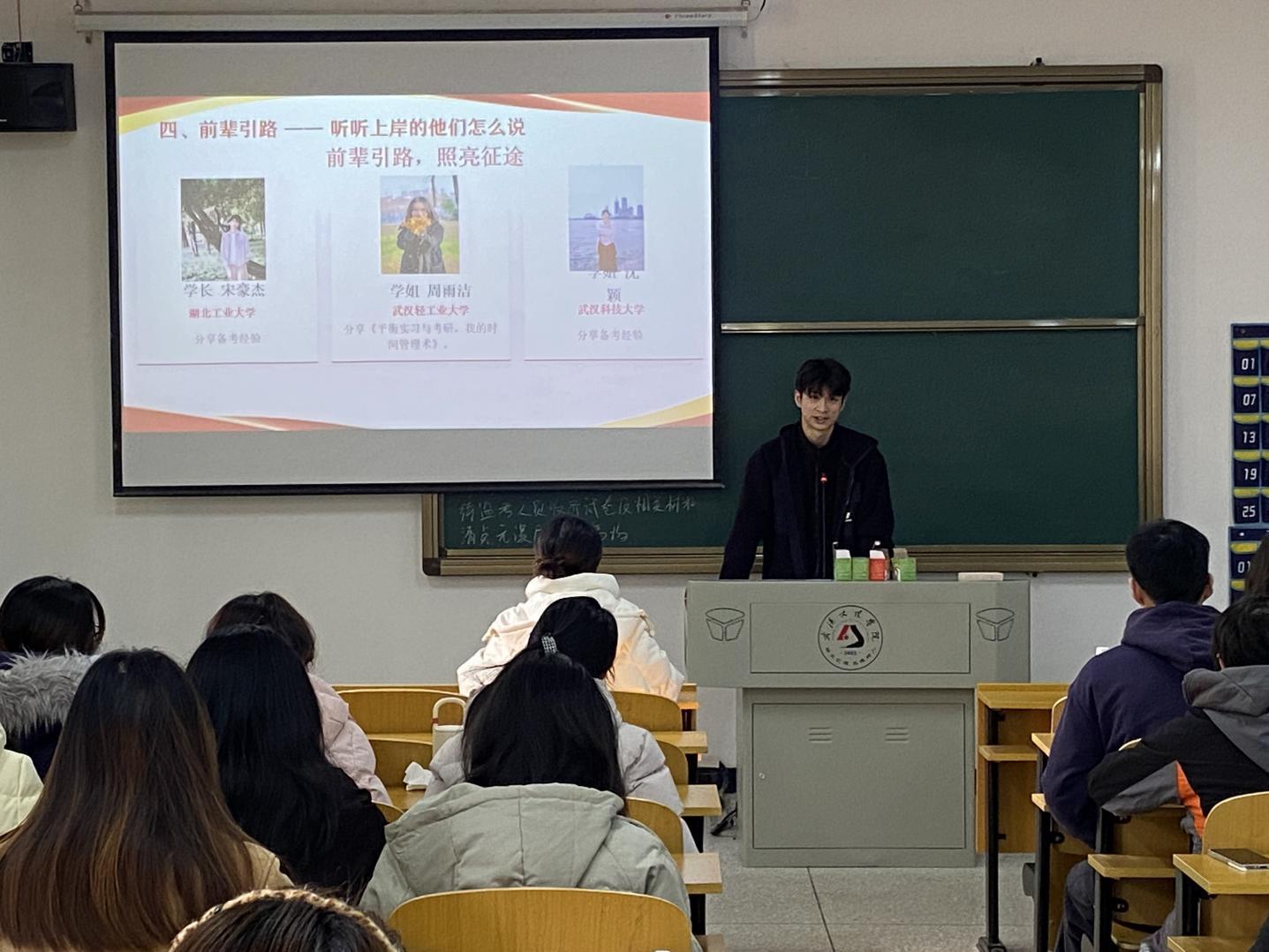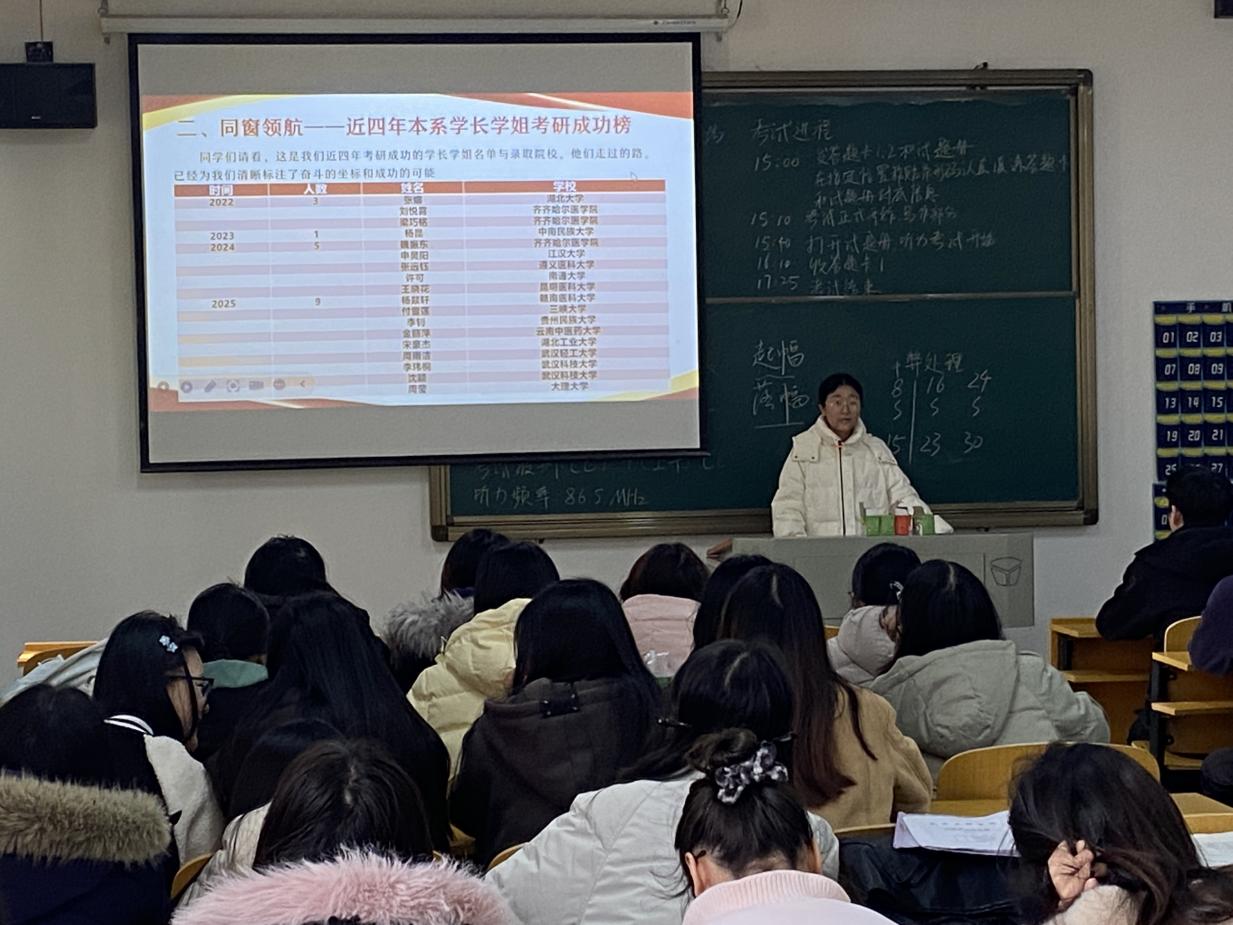 为帮助药学专业学子明晰发展方向,树立考研目标,营造积极向上的学习氛围,yl6809永利集团药学系于2025年12月17日在4-120召开了面向2023级全体学生的考研动员大会。本次大会由药学系刘莹莹老师主持,并特邀2025届考研成功的优秀毕业生代表周雨洁(录取至武汉轻工业大学)、宋豪杰(录取至湖北工业大学)返回母校,为学弟学妹们带来精彩分享。