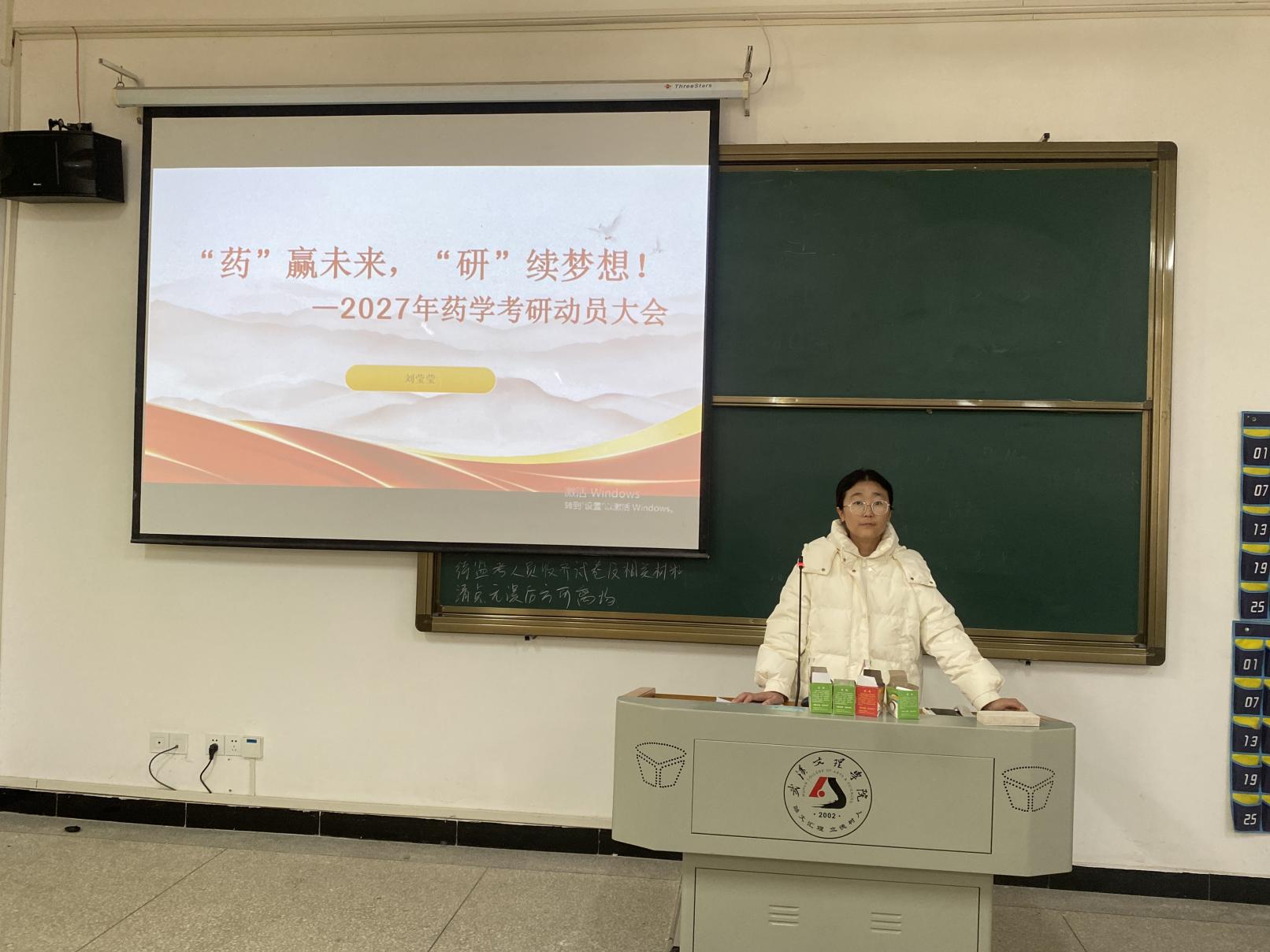 大会伊始,刘莹莹老师首先立足药学专业发展现状与就业前景,深入分析了考研深造对个人学术提升、职业发展及行业竞争力的重要意义。她系统介绍了近年来药学类研究生招考的整体趋势、主要方向和备考阶段,并鼓励同学们及早规划、明确目标、科学备考,以坚定的决心和持续的努力迎接挑战。刘老师强调,药学系将全力为考研学子提供支持与帮助,成为同学们奋斗路上的坚实后盾。