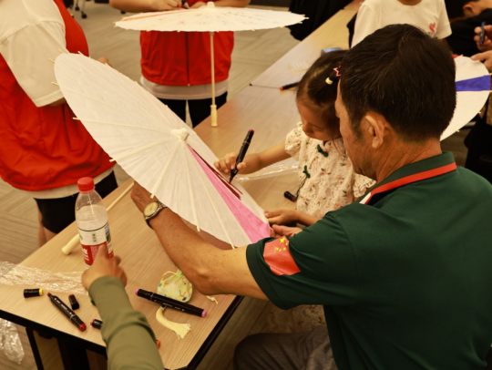 家长与孩子共同协作,现场充满温馨与欢乐。将想象化作色彩,荷花摇曳、蜻蜓点水,可爱的卡通形象跃然伞上,亲子间的温馨瞬间也定格成绚丽的图案。