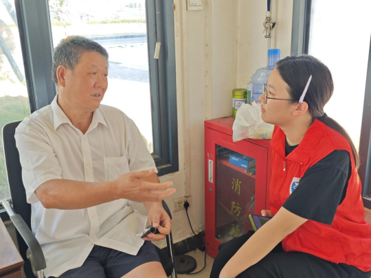 在湖畔社区,实践队师生带队走访了退伍军人严黄开、退休干部余永康、退伍军人兼党员石章炳等居民。实践队员们与他们热情攀谈,采访和聆听他们的工作、生活故事,了解葛店经开区的历史和变化,感受他们的人生智慧,并为他们进行做健康宣讲。