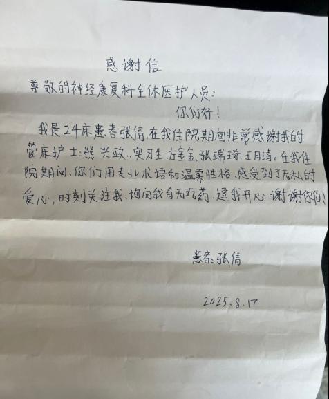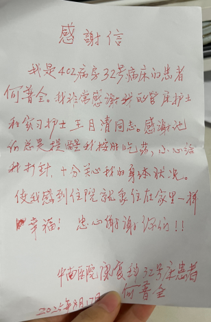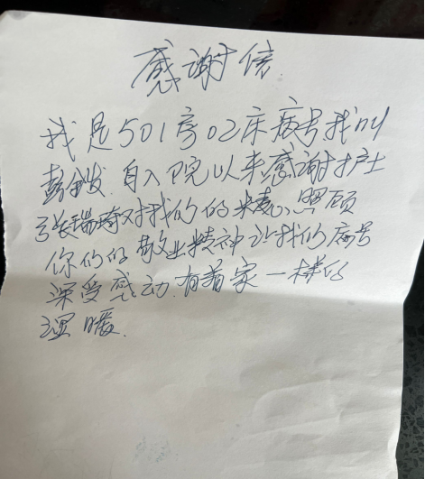 患者顺利出院后,张依琳收到了对方手写的感谢信。信中细致描述了细心护理为患者带去的从对住院的恐惧到安心放松并且晚上安睡入梦的心理变化,这份肯定激励着她继续以真心护理患者,让护理充满温度。