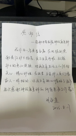 “杨老师和病人之间像亲人一样的关系缓解了我们最初实习的局促,我们学着老师的样子和病人沟通关心,送去帮助“,吴丹妮和孙越接到患者感谢信后由衷地感叹带教老师对她们的教育和影响。