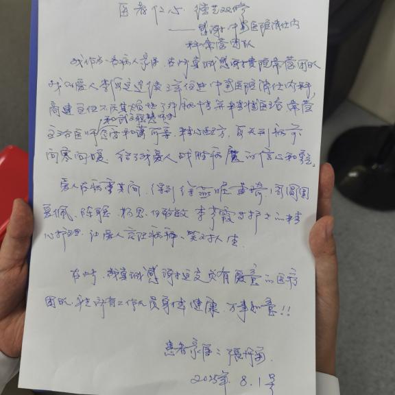 一位即将做胃肠镜切息肉手术的患者在术前显得异常焦虑,频繁地到护士站询问手术细节。黄琦耐心地回答,并且手把手指导她如何喝泻药清肠,告知她手术前的注意事项,详细的解答和指导以及阳光灿烂的微笑舒缓了患者紧张的情绪。细心的呵护何何交流拉近了患者对医院的信任。出院当天她写下的感谢信。