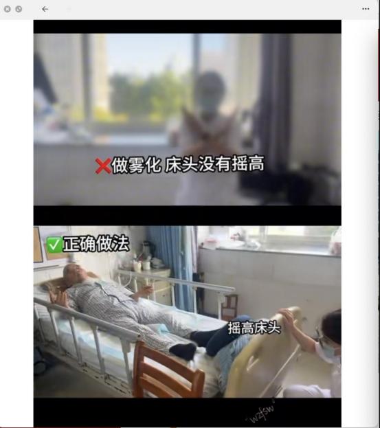 视频作品摒弃了生硬的说教,用镜头捕捉和还原了多个日常场景,通过正反做法示范了如何规范收纳轮椅以保持通道畅通,如何正确使用配餐间的电源,如何正确做雾化等指导。镜头画面简洁明了,语言通俗亲切,